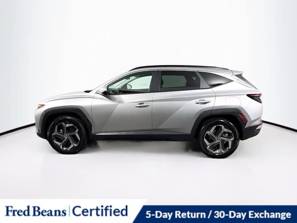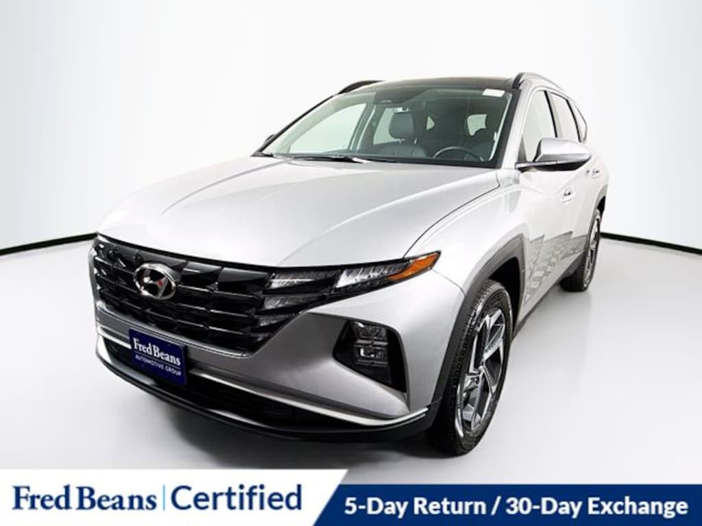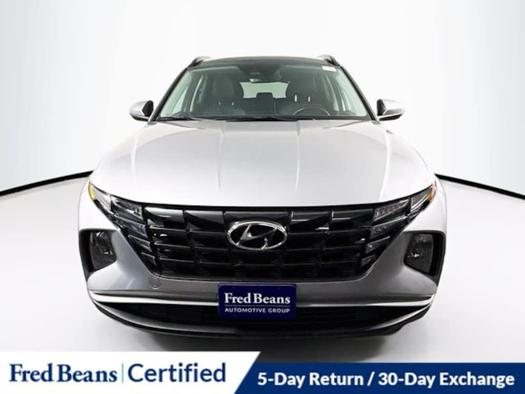 Recent Arrival! 2023 Hyundai Tucson Hybrid SEL Convenience SEL Convenience I4 6-Speed Automatic AWD 4D Sport Utility Shimmering Silver Local Trade, Great Service History, Factory Certified Vehicle, Free First Oil Change, 5 Day Return / 30 Day Exchange, Auto Rewards Program, I4, Apple CarPlay & Android Auto, Auto High-beam Headlights, Front dual zone A/C, H-Tex Seat Trim, Heated door mirrors, Heated front seats, Illuminated entry, Navigation System, Power door mirrors, Power driver seat, Power Liftgate, Power moonroof, Radio: AM/FM/HD/SiriusXM Audio System, Steering wheel mounted audio controls, Turn signal indicator mirrors, Wheels: 19" x 7.5" J Machine-Face Finish Alloy.