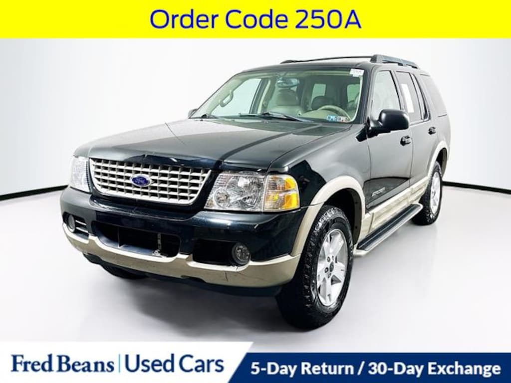 2005 Ford Explorer Eddie Bauer 4.0L V6 SOHC Flex Fuel 5-Speed Automatic 4WD 4D Sport Utility Black Local Trade, 17" Sparkle Silver Painted Cast Aluminum Wheels, Audiophile AM/FM Stereo w/In-Dash 6 CD Chgr, Automatic temperature control, Front Bucket Seats, Front dual zone A/C, Front fog lights, Heated door mirrors, Heated front seats, Leather-Trimmed Low Back Sport Buckets, Order Code 250A, Power door mirrors, Power driver seat, Power passenger seat, Power windows, Rear window defroster, Rear window wiper, Remote keyless entry, Speed control, Tilt steering wheel.