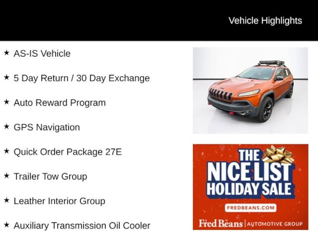 AS-IS Vehicle, 5 Day Return / 30 Day Exchange, Auto Reward Program, 7 & 4 Pin Wiring Harness, 8.4" Touchscreen Display, Auxiliary Transmission Oil Cooler, Class III Receiver Hitch, GPS Navigation, Heated Front Seats, Heated Steering Wheel, Jeep Rack Off Road Accessory Kit, Leather Interior Group, Leather Trimmed Bucket Seats, Power 4-Way Driver Lumbar Adjust, Power 8-Way Driver Seat, Quick Order Package 27E, Trailer Tow Group, Trailer Tow Wiring Harness, 1 Year Trial (Registration Required), 17" x 7.5" Aluminum Wheels, 4-Wheel Disc Brakes, 6 Speakers, ABS brakes, Accent Color Exterior Mirrors, Air Conditioning, Alloy wheels, AM/FM radio: SiriusXM, Anti-whiplash front head restraints, Brake assist, Cloth/Leather/Vinyl Bucket Seats, Compass, Delay-off headlights, Driver door bin, Driver vanity mirror, Dual front impact airbags, Dual front side impact airbags, Electronic Stability Control, Emergency communication system, Engine Oil Cooler, Four wheel independent suspension, Front anti-roll bar, Front Bucket Seats, Front Center Armrest, Front fog lights, Front reading lights, Fully automatic headlights, GPS Antenna Input, HD Radio, Illuminated entry, Integrated Voice Command w/Bluetooth, Knee airbag, Leather Shift Knob, Low tire pressure warning, Occupant sensing airbag, Off Road Suspension, Outside temperature display, Overhead airbag, Overhead console, Panic alarm, ParkView Rear Back-Up Camera, Passenger door bin, Passenger vanity mirror, Power door mirrors, Power steering, Power windows, Radio data system, Radio: Uconnect 8.4, Radio: Uconnect 8.4 NAV, Rear anti-roll bar, Rear reading lights, Rear seat center armrest, Rear side impact airbag, Rear window defroster, Rear window wiper, Remote keyless entry, Roof rack: rails only, Speed control, Speed-sensing steering, Split folding rear seat, Spoiler, Steering wheel mounted audio controls, Tachometer, Telescoping steering wheel, Tilt steering wheel, Traction control, Trip computer, Uconnect Access, Variably intermittent wipers, Voltmeter, Wheels: 17" x 7.5" Black Painted Aluminum, 7 & 4 Pin Wiring Harness, 8.4" Touchscreen Display, Auxiliary Transmission Oil Cooler, Class III Receiver Hitch, GPS Navigation, Heated Front Seats, Heated Steering Wheel, Jeep Rack Off Road Accessory Kit, Leather Interior Group, Leather Trimmed Bucket Seats, Power 4-Way Driver Lumbar Adjust, Power 8-Way Driver Seat, Quick Order Package 27E, Trailer Tow Group, Trailer Tow Wiring Harness.