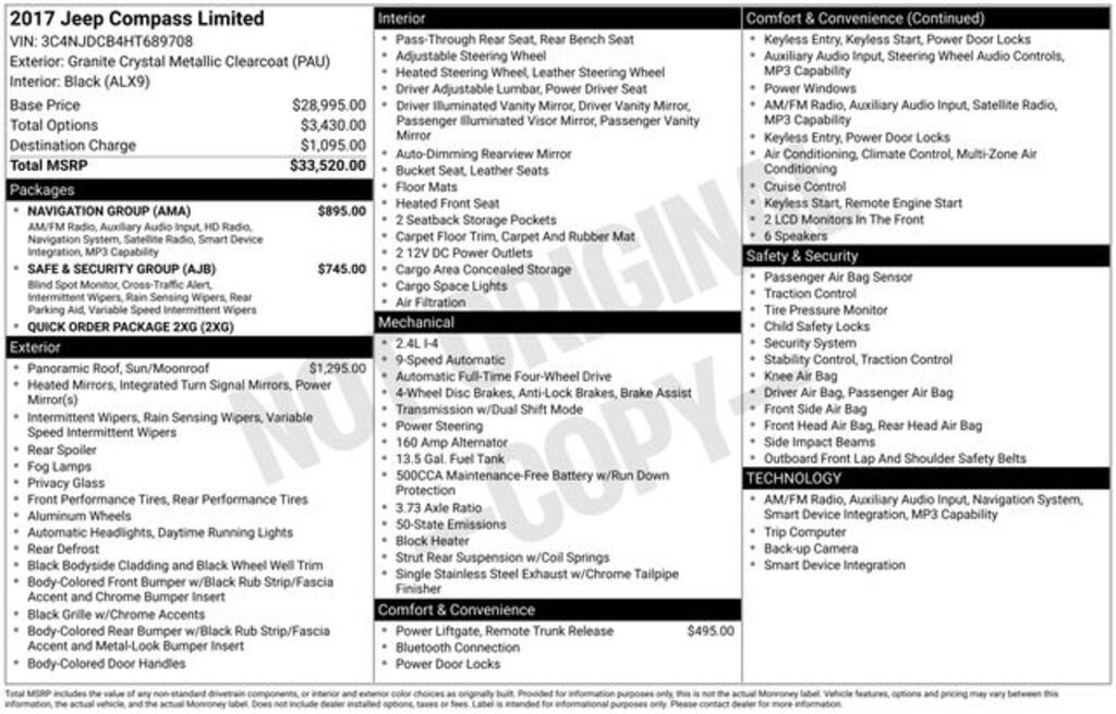 Recent Arrival! 2017 Jeep New Compass Limited 2.4L I4 MultiAir 9-Speed Automatic 4WD 4D Sport Utility Granite Crystal Metallic Clearcoat Local Trade, 1-Year SiriusXM Guardian Trial, 5-Year SiriusXM Traffic Service, 5-Year SiriusXM Travel Link Service, Automatic temperature control, Blind Spot & Cross Path Detection, For Details Visit DriveUconnect.com, Front dual zone A/C, Front fog lights, GPS Navigation, HD Radio, Heated door mirrors, Heated front seats, Heated steering wheel, Leather Trimmed Bucket Seats, Navigation Group, ParkSense Rear Park Assist System, ParkView Rear Back-Up Camera, Power door mirrors, Power driver seat, Power Front/Fixed Rear Full Sunroof, Power Liftgate, Power windows, Quick Order Package 2XG, Radio: Uconnect 4 w/8.4" Display, Radio: Uconnect 4C Nav w/8.4" Display, Rain sensing wipers, Rain Sensitive/Intermittent Wipers, Rear window defroster, Rear window wiper, Remote keyless entry, Safe & Security Group, SiriusXM Traffic Plus, SiriusXM Travel Link, Speed control, Tilt steering wheel, Wheels: 18" x 7.0" Polished/Gray Pockets Aluminum. 22/30 City/Highway MPG